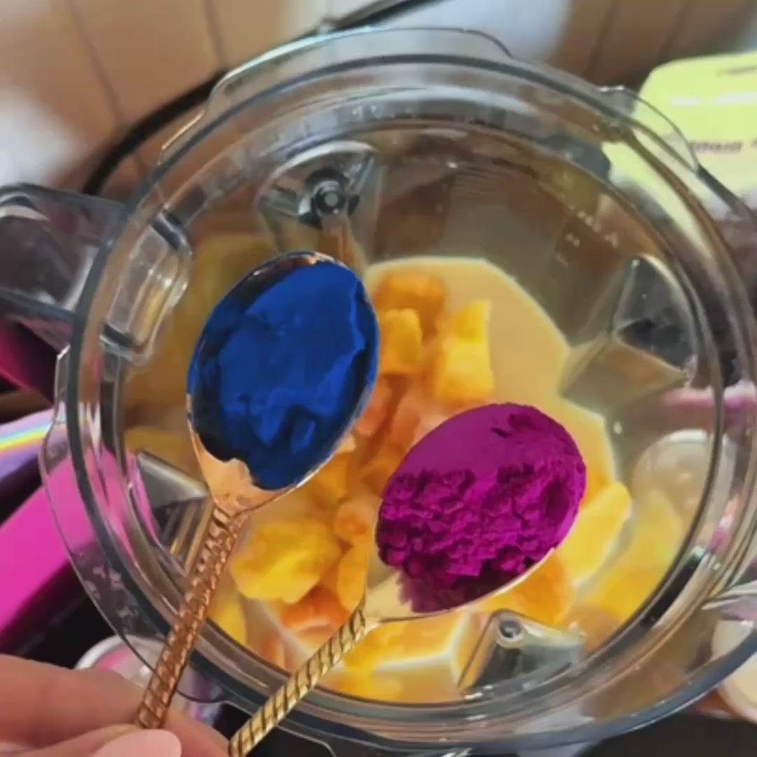 Add 1 teaspoon of Pink Pitaya Powder or Blue Spirulina Powder (or both!) to your smoothie, juice, yogurt, or bowl.